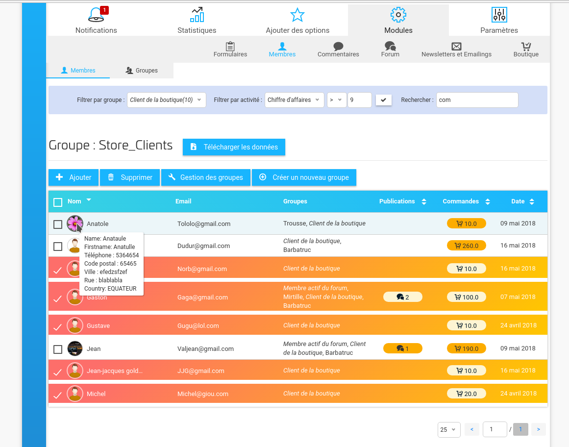 - Technical analyses. - Unit graphic redesign. ----> Addition of many functionalities: - Structural changes on databases. - Increase of available data + processing. - Complete management of members structure to ease commercial and marketing actions. - Improvement and optimisation of user's experience : grouped actions, faster loading, research, sorting, user-friendly UI. - Dissemination of those functionalities in appropriate modules related to members and commercial management.